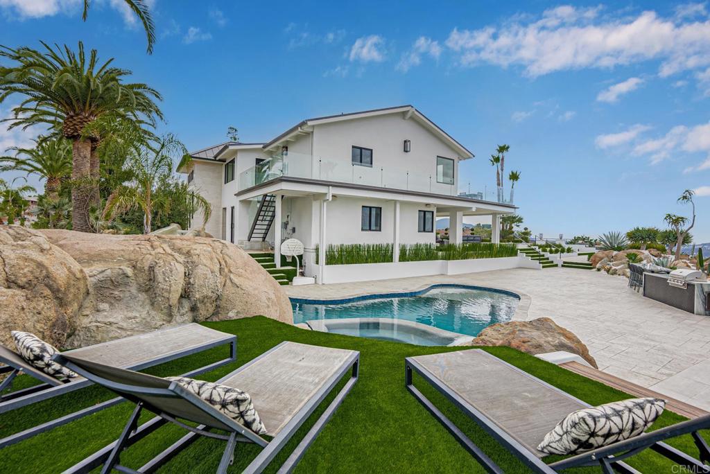 One of Rancho San Diego's finest Estates sitting on top of the mountain w STUNNING panoramic ocean views! This one of kind home is setup to entertain at the highest level possible as well as enjoying the good life on the daily! Wrought iron gated entrance with circular driveway invites you into this gorgeous modern contemporary home! Designed to enhance the views, this outdoor area offers multiple sitting areas to enjoy the million-dollar views from anywhere you desire!! Great room style living with open floorplan that boosts a gorgeous kitchen w lit up Island that opens up to your dining room and living room area! The living room area has sliding pocket doors that open and adjoin the outdoor deck to make for the perfect indoor/outdoor living that highlight the ocean views! The outdoor kitchen offers flat screen TV, heaters, bar, refrigerator, sink, ice machine, large serving counter space & dining table that is over-looking the playground for you to enjoy views all around you! Motor home parking, 32 Panel LG 10Kw solar system is owned, 8 zone indoor & outdoor sound system, Standing Seam metal roof w 50 year lifespan, fruit trees, playground, fire-pit, BBQ, pool, jacuzzi, sunbathing deck, outdoor pool bathroom, outdoor covered kitchen equipped w heaters, room for guest house addition and so much more! Camera system, alarm, music, solar & pool are all controlled by your cell phone or Ipad!