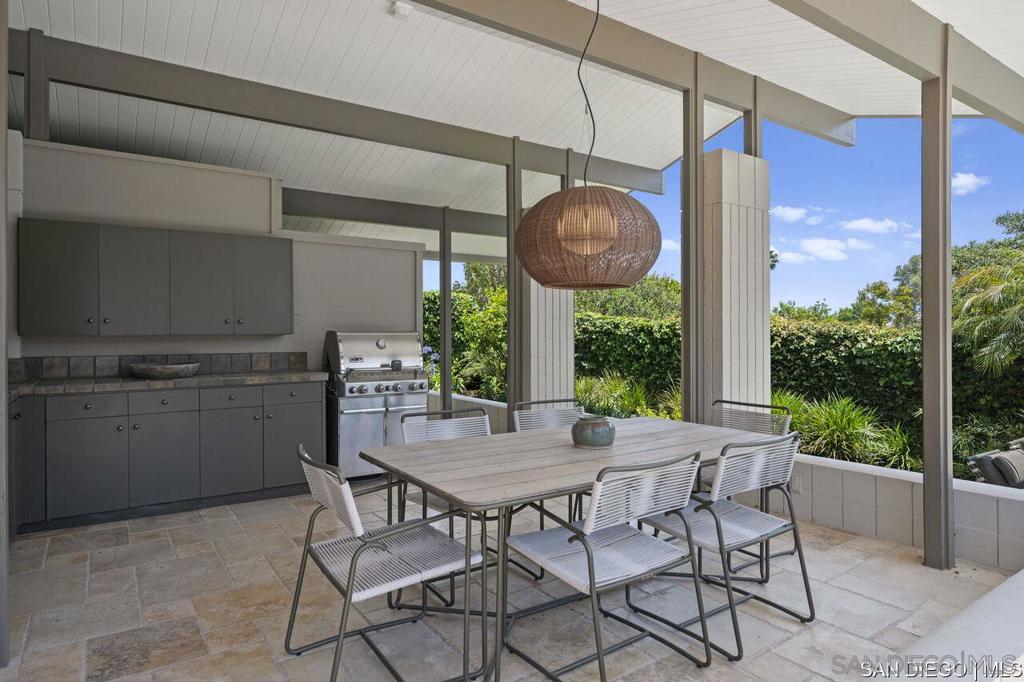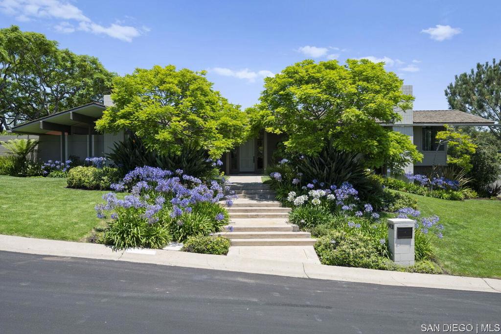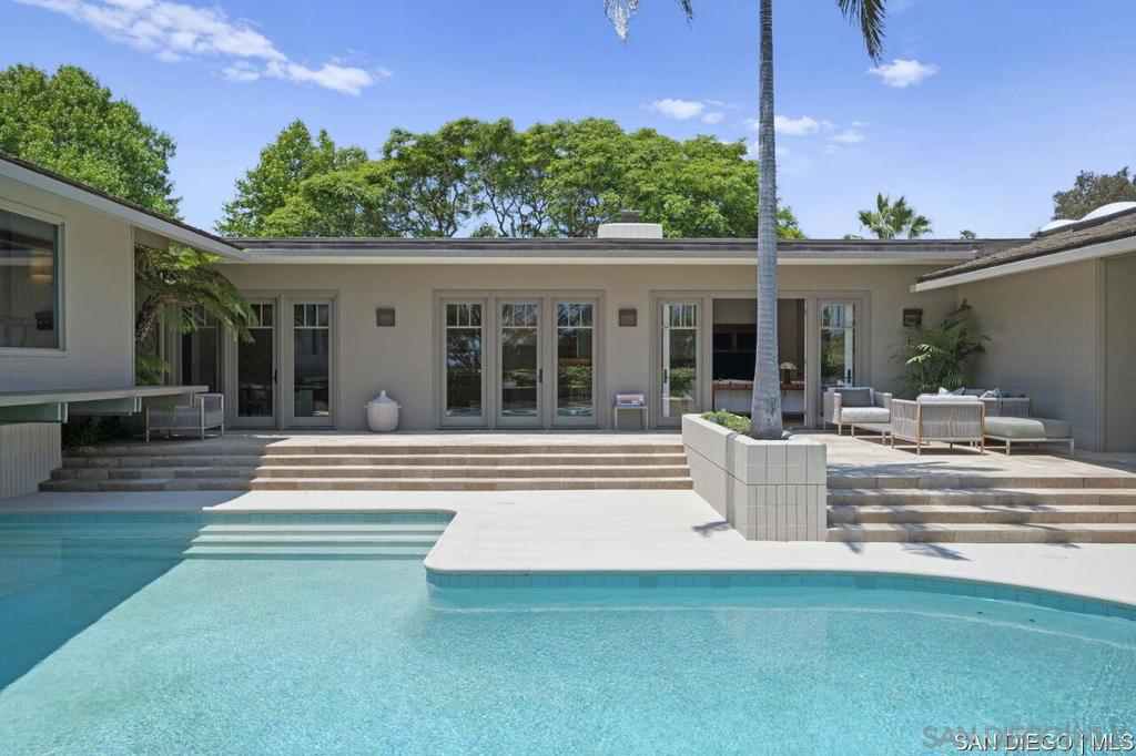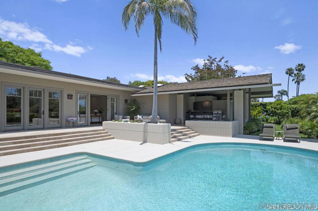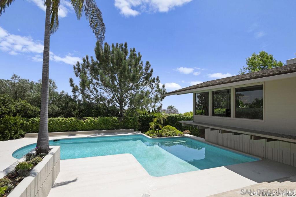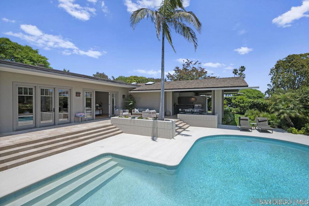 Welcome to this exquisite single-story ranch-style home, an oasis of tranquility nestled on a generous half-acre in the sought-after Muirlands neighborhood of La Jolla. Originally crafted in 1962 by the esteemed architect Dale Naegle during the zenith of the Southern California modernist movement, this sprawling residence seamlessly intertwines classic design with contemporary sensibilities. Step into a grand entry foyer, where clerestory windows and vaulted ceilings invite natural light and a wonderful light and airy ambience throughout. This residence is an entertainer's dream, boasting multiple rooms that flow effortlessly onto a spacious terrace, providing breathtaking southern views and an enchanting outdoor dining area. The captivating pool, surrounded by lush landscaping, is complemented by a fully appointed outdoor kitchen, cabana and bath, creating your own mini-resort atmosphere for family and guests. Each of the five generously sized bedrooms is intuitively separated into guest and family wings, ensuring privacy. The grand primary suite offers a serene retreat with an adjacent private study, complete with its own fireplace, the perfect sanctuary for work or quiet reflection. The open-concept kitchen is a bright culinary haven, complete with a built-in desk, a sunny breakfast area, and updated amenities that blend functionality with style. The formal dining room overlooks the pool, inviting al fresco dining at its finest. Thoughtfully remodeled while preserving its original charm, this home also includes a mudroom, dual AC systems, abundant storage, and an oversiz