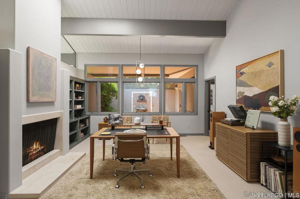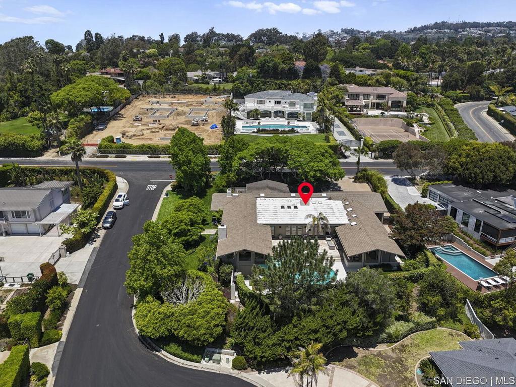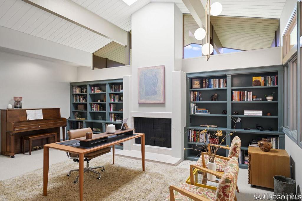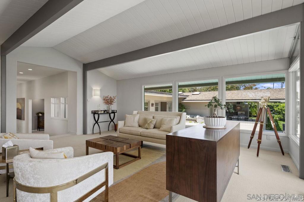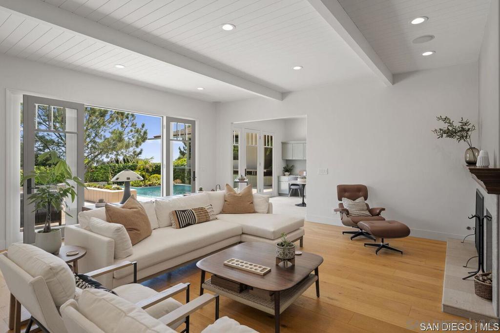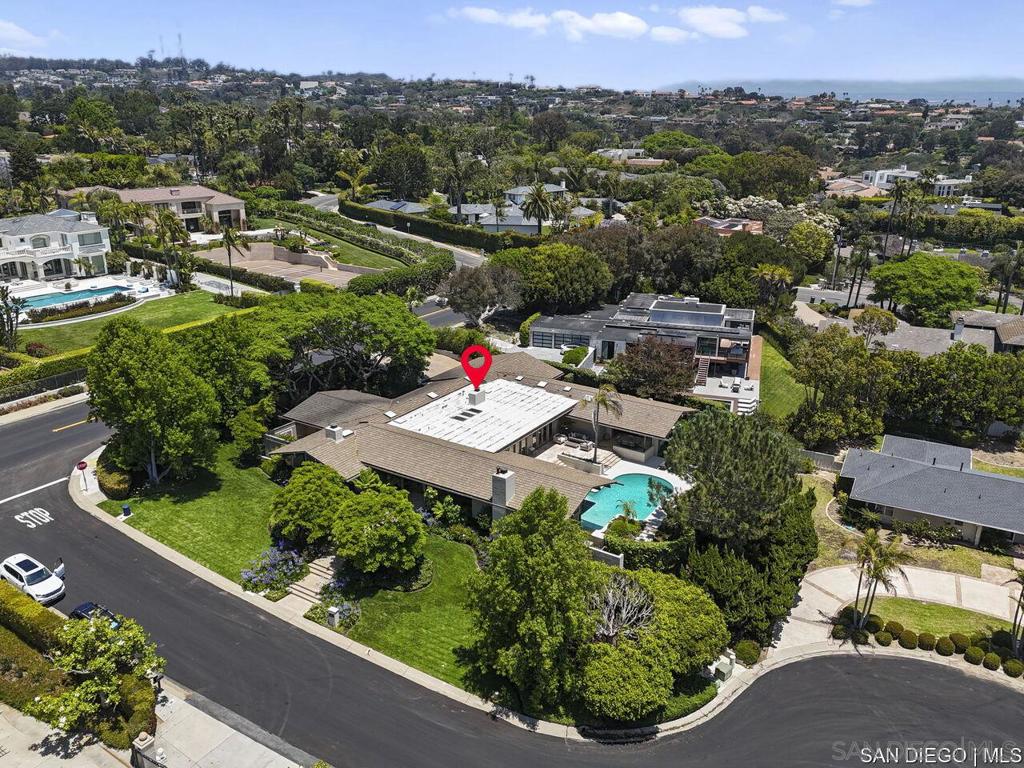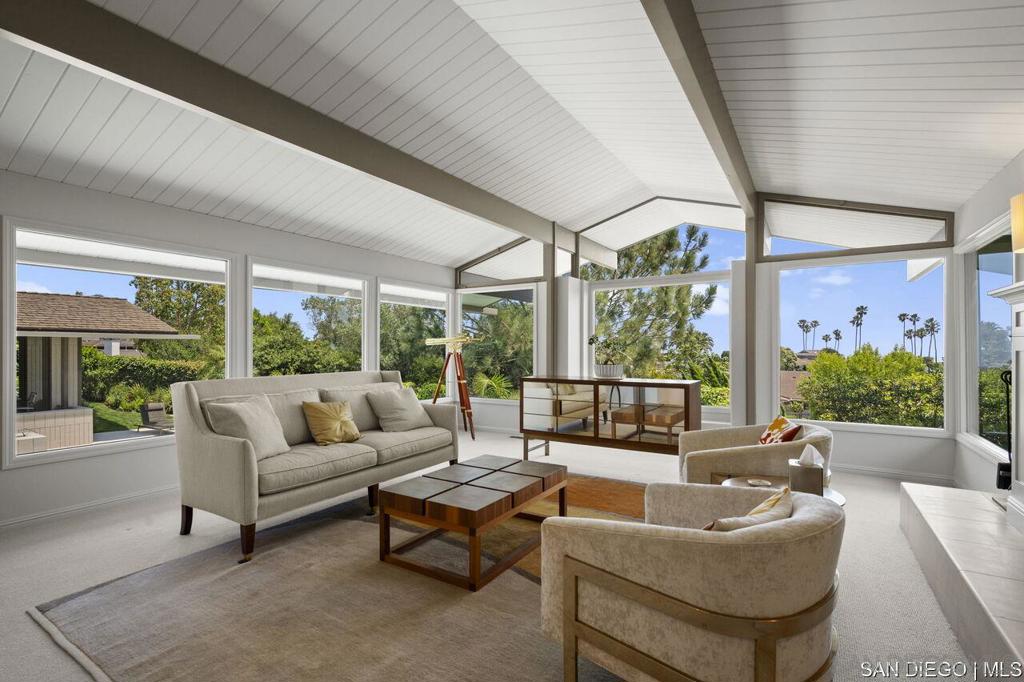 Welcome to this exquisite single-story ranch-style home, an oasis of tranquility nestled on a generous half-acre in the sought-after Muirlands neighborhood of La Jolla. Originally crafted in 1962 by the esteemed architect Dale Naegle during the zenith of the Southern California modernist movement, this sprawling residence seamlessly intertwines classic design with contemporary sensibilities. Step into a grand entry foyer, where clerestory windows and vaulted ceilings invite natural light and a wonderful light and airy ambience throughout. This residence is an entertainer's dream, boasting multiple rooms that flow effortlessly onto a spacious terrace, providing breathtaking southern views and an enchanting outdoor dining area. The captivating pool, surrounded by lush landscaping, is complemented by a fully appointed outdoor kitchen, cabana and bath, creating your own mini-resort atmosphere for family and guests. Each of the five generously sized bedrooms is intuitively separated into guest and family wings, ensuring privacy. The grand primary suite offers a serene retreat with an adjacent private study, complete with its own fireplace, the perfect sanctuary for work or quiet reflection. The open-concept kitchen is a bright culinary haven, complete with a built-in desk, a sunny breakfast area, and updated amenities that blend functionality with style. The formal dining room overlooks the pool, inviting al fresco dining at its finest. Thoughtfully remodeled while preserving its original charm, this home also includes a mudroom, dual AC systems, abundant storage, and an oversiz