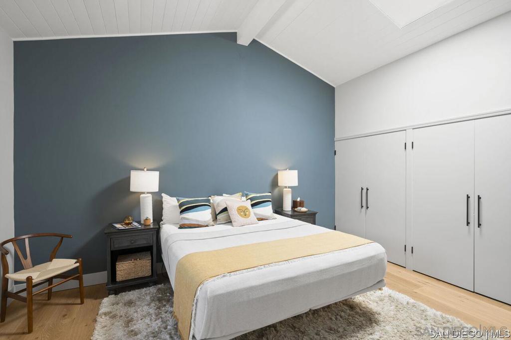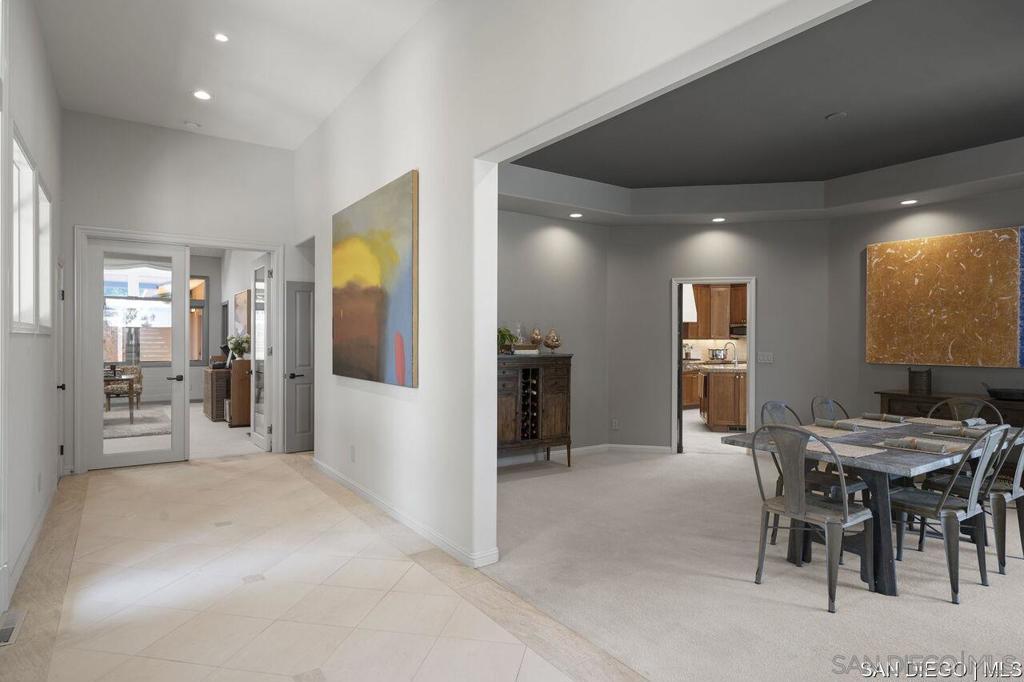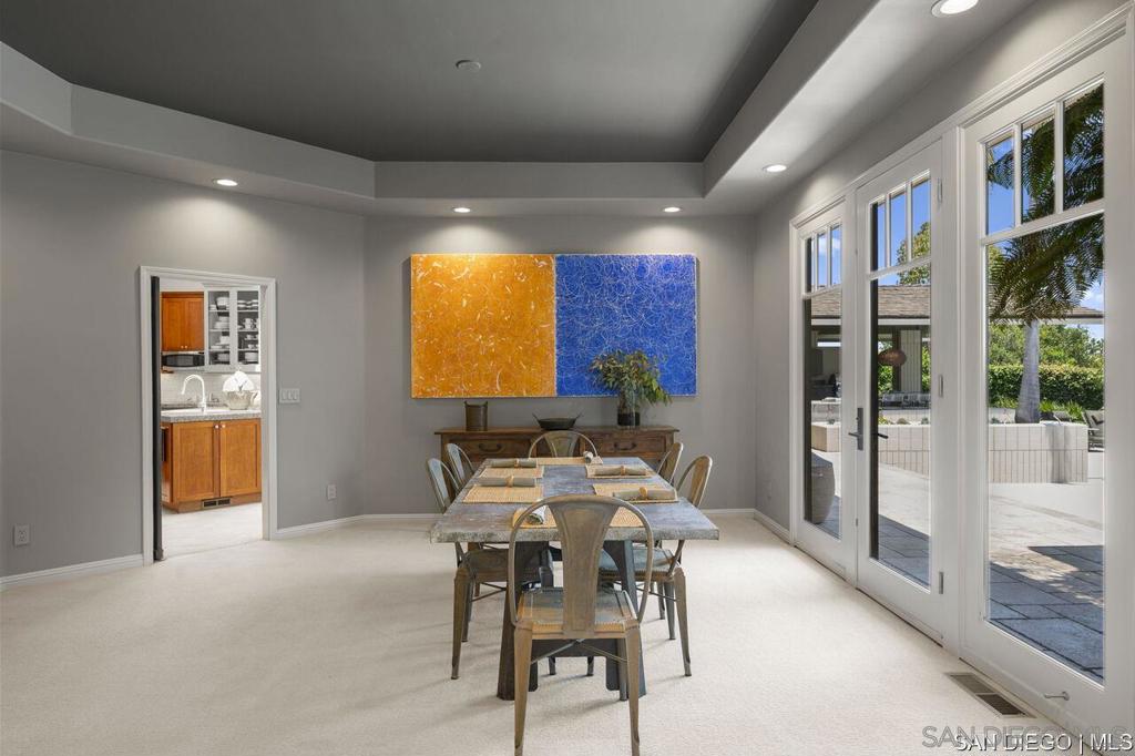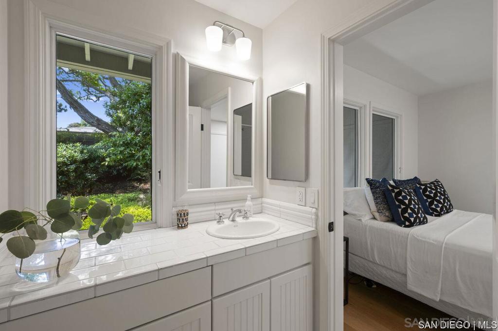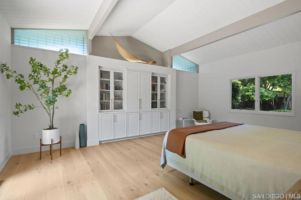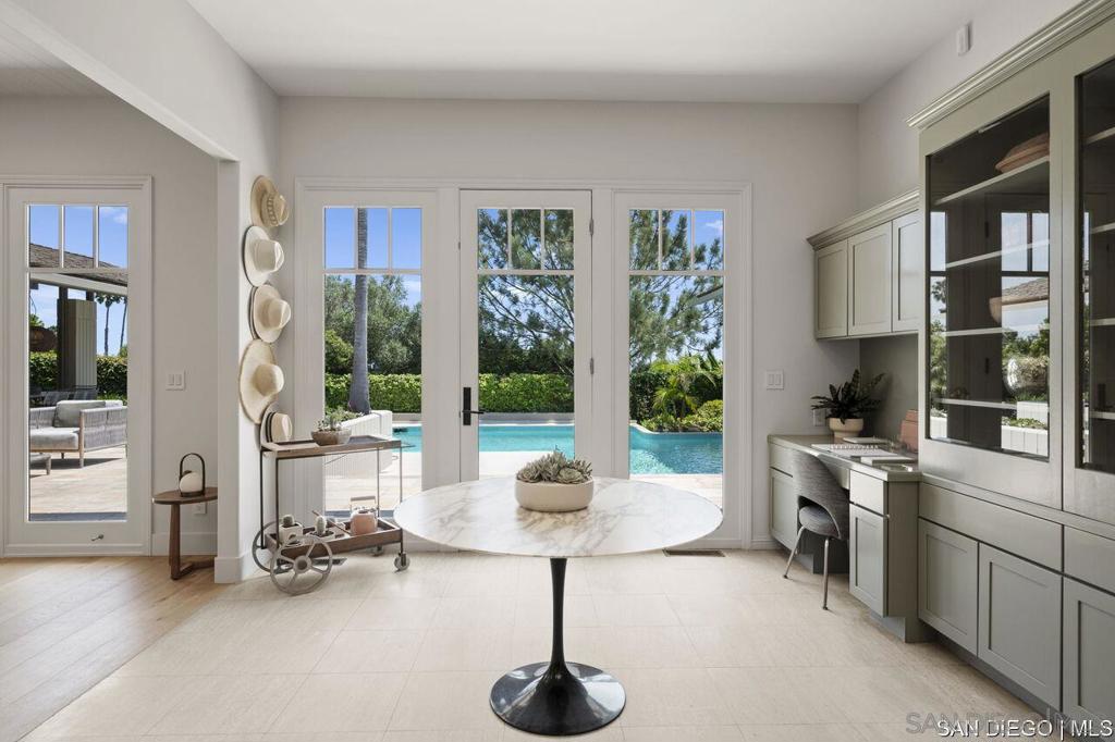Welcome to this exquisite single-story ranch-style home, an oasis of tranquility nestled on a generous half-acre in the sought-after Muirlands neighborhood of La Jolla. Originally crafted in 1962 by the esteemed architect Dale Naegle during the zenith of the Southern California modernist movement, this sprawling residence seamlessly intertwines classic design with contemporary sensibilities. Step into a grand entry foyer, where clerestory windows and vaulted ceilings invite natural light and a wonderful light and airy ambience throughout. This residence is an entertainer's dream, boasting multiple rooms that flow effortlessly onto a spacious terrace, providing breathtaking southern views and an enchanting outdoor dining area. The captivating pool, surrounded by lush landscaping, is complemented by a fully appointed outdoor kitchen, cabana and bath, creating your own mini-resort atmosphere for family and guests. Each of the five generously sized bedrooms is intuitively separated into guest and family wings, ensuring privacy. The grand primary suite offers a serene retreat with an adjacent private study, complete with its own fireplace, the perfect sanctuary for work or quiet reflection. The open-concept kitchen is a bright culinary haven, complete with a built-in desk, a sunny breakfast area, and updated amenities that blend functionality with style. The formal dining room overlooks the pool, inviting al fresco dining at its finest. Thoughtfully remodeled while preserving its original charm, this home also includes a mudroom, dual AC systems, abundant storage, and an oversiz